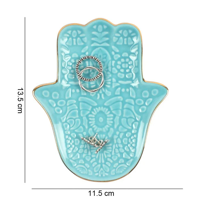 A beautiful bright turquoise ceramic jewellery dish. Hamsa hand design with intricate pattern and gold edge. Hamsa is a open right hand, an image recognized and used as a sign of protection in many times throughout history, the hamsa is believed by middle easterners, to provide defense against the evil eye. The hamsa holds recognition as a bearer of good fortune among Christians in the Middle East as well.