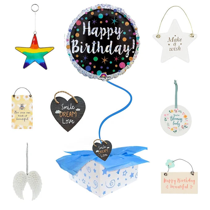 A Balloon in a colourful box packed with tissue paper and tissue confetti and sent with this keepsake weight attached.