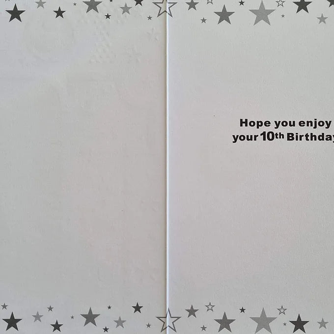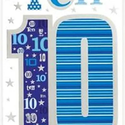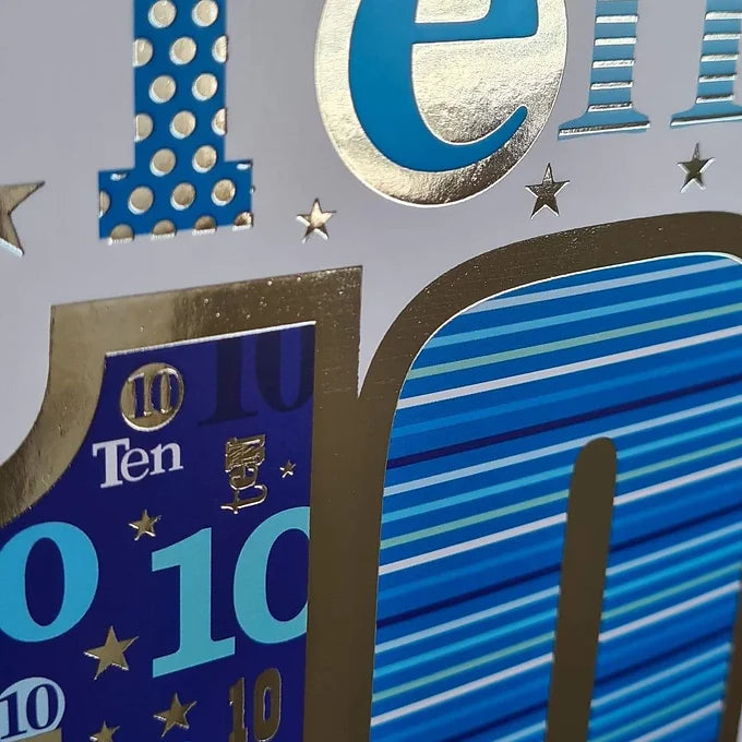 Ten and a Big number 10 below in blues with silver foil elements on a white background.