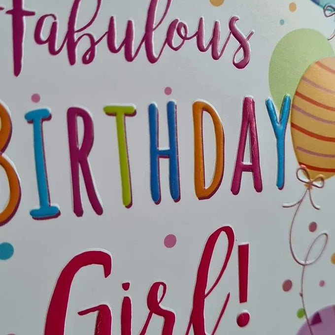 Colourful lettering surrounded by colourful balloons and confetti. Includes some pink foil lettering.