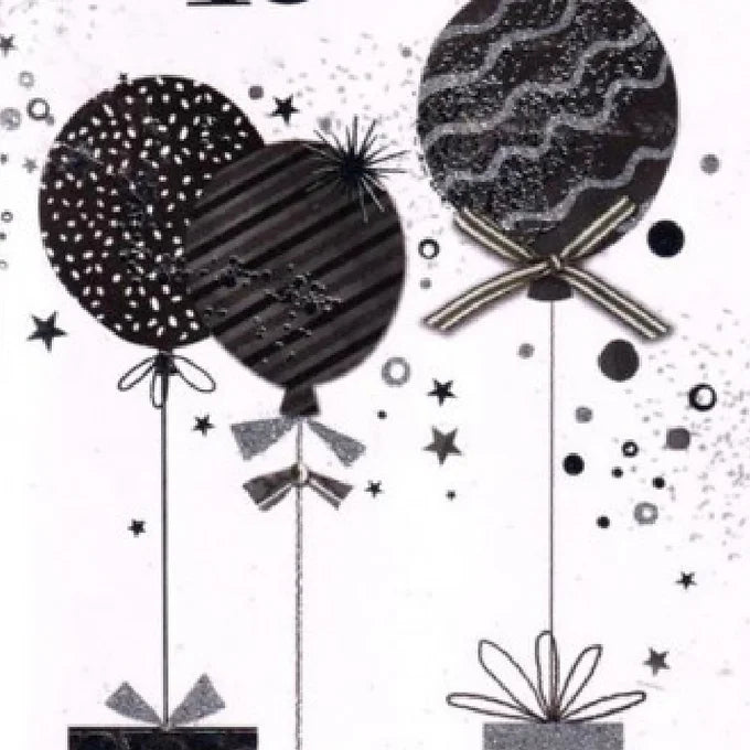 Balloons, Gifts, Stars, with silver foil lettering and elements.