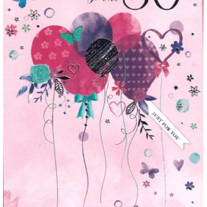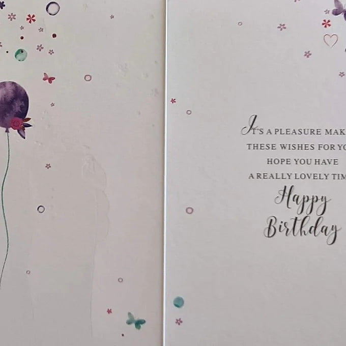 Balloons, flowers, butterflies, hearts, with silver foil lettering and elements.