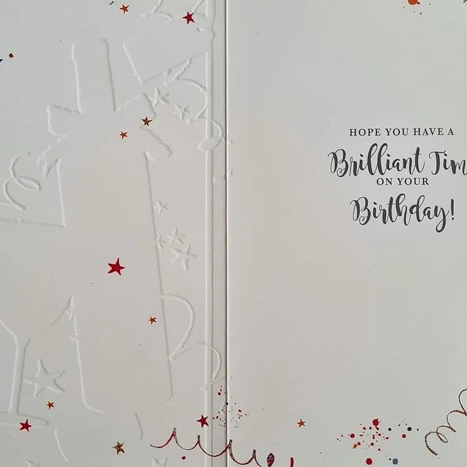 Wine and decorations with gold glitter effects and gold foil lettering.