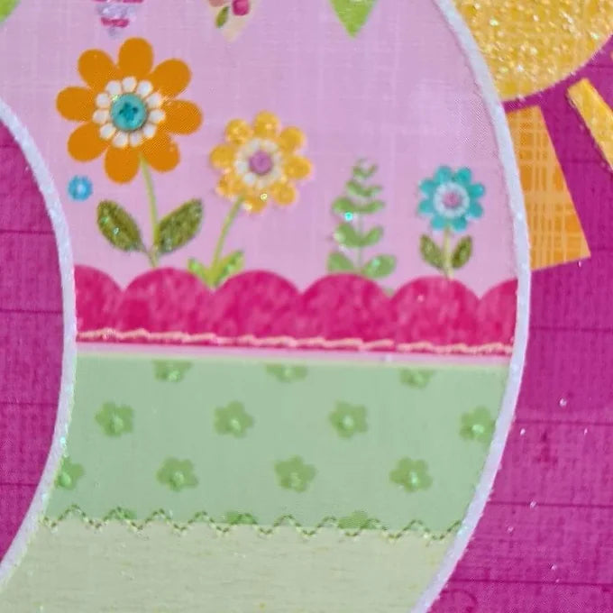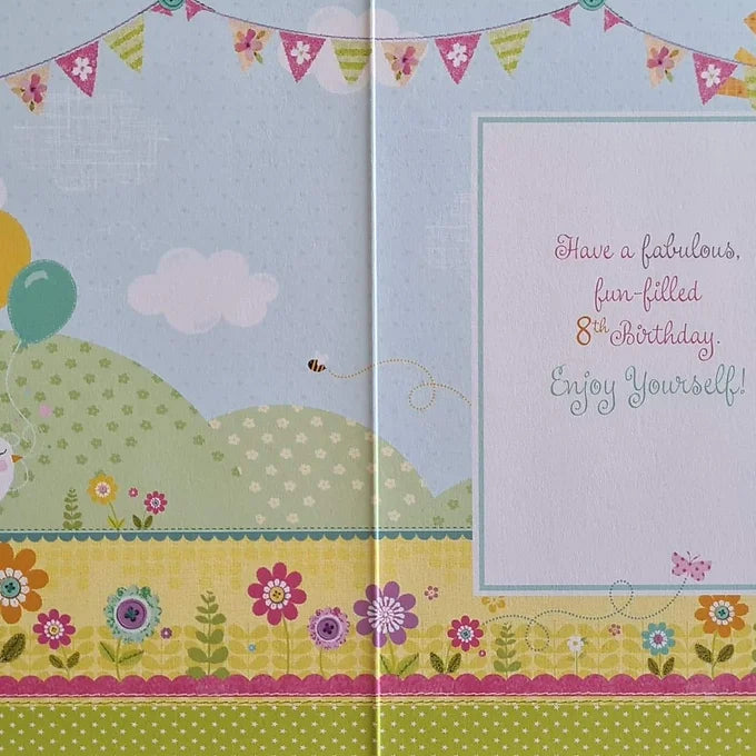 8 A big 8 with the sunshine and some colourful garden scenes with glittery effects on a pink background, and a little bird sat on the 8 with balloons.