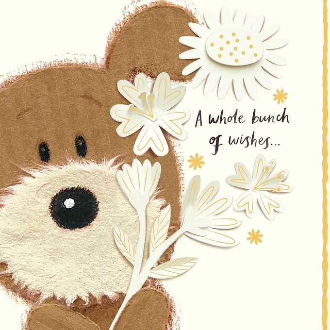 Birthday card with a cute dog holding a bunch of flowers with gold print.