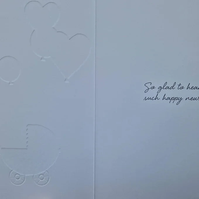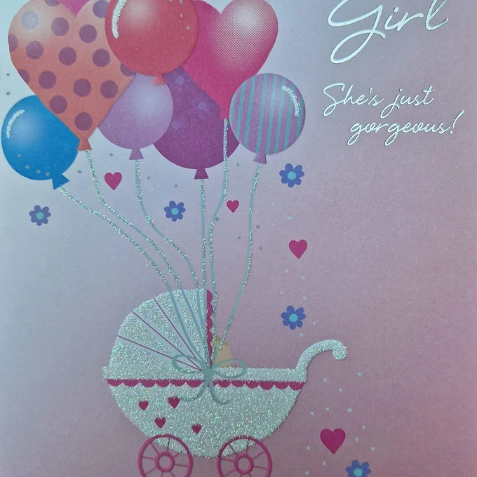 Baby Girl card with balloons, hearts, stars, and silver lettering and glitter.