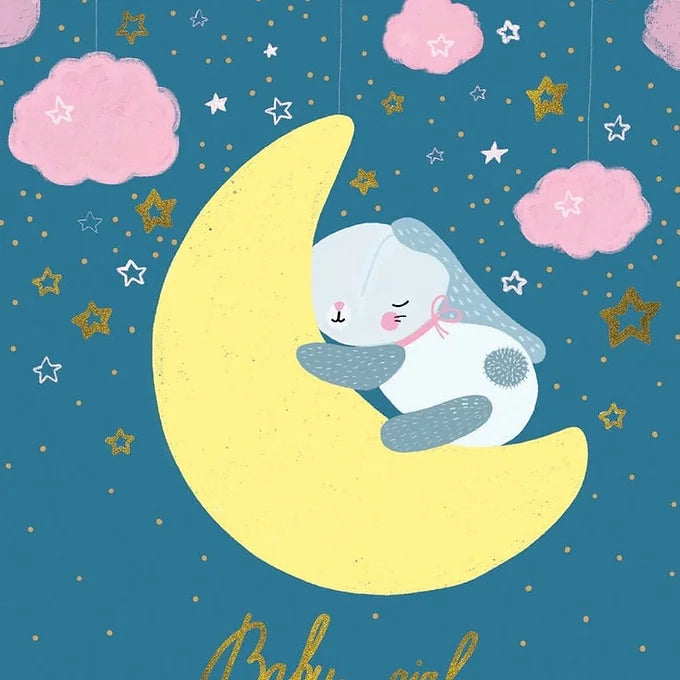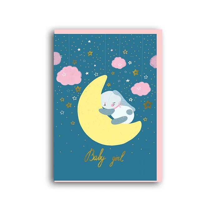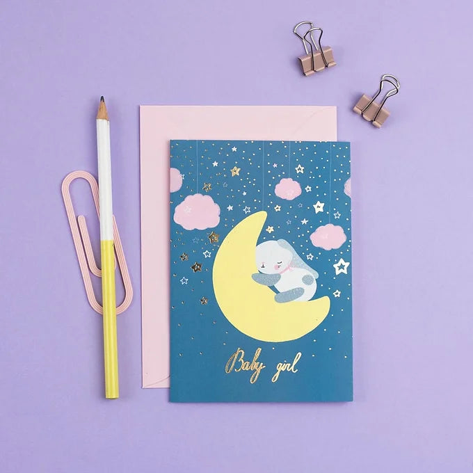 Baby Girl Card - Cute bunny on the moon with gold foil lettering and elements.