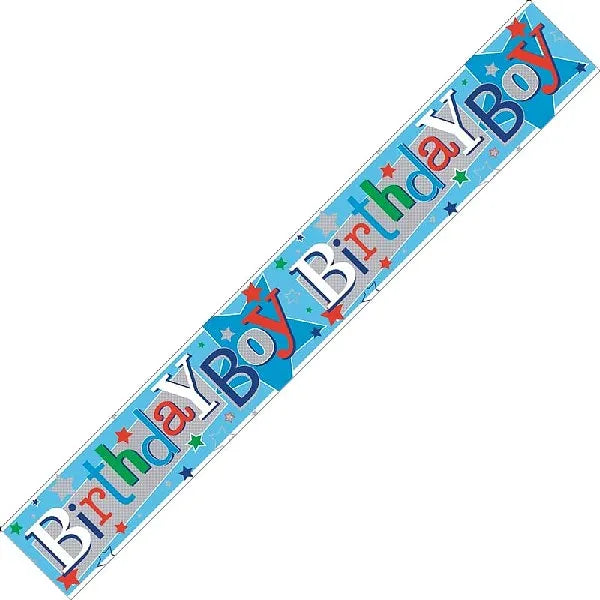 Blue holobanner with silver lettering and stars in 3 repeated sections.