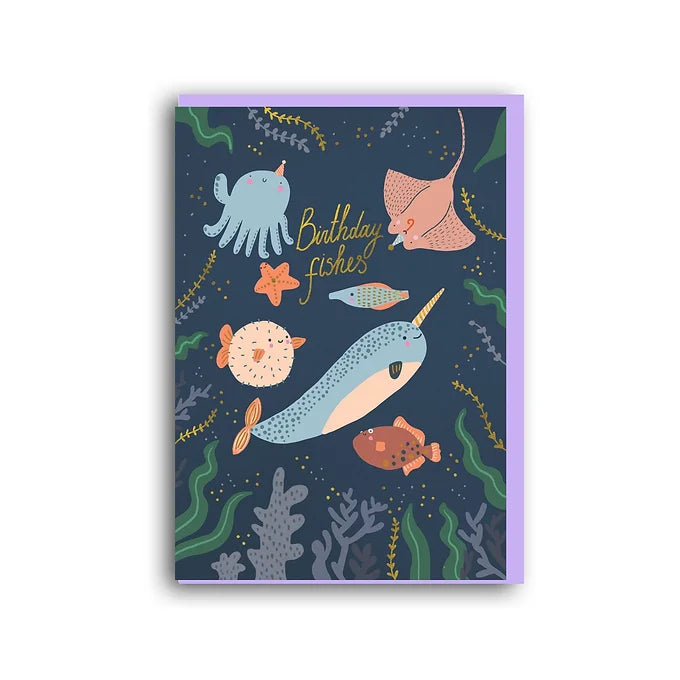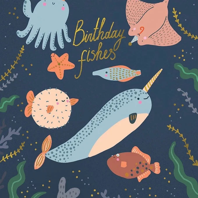 Birthday Fishes Card, Funny and colourful with gold foiled elements on top.