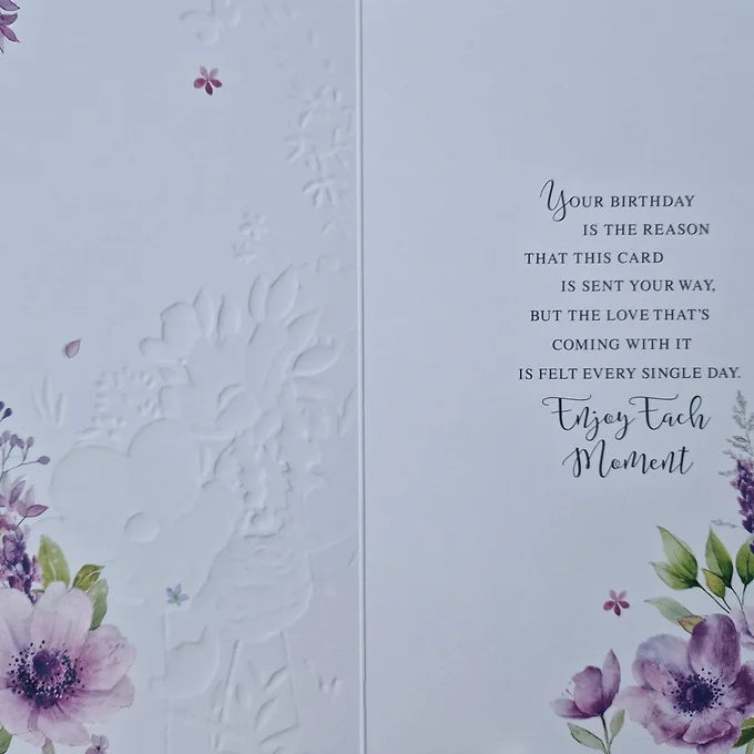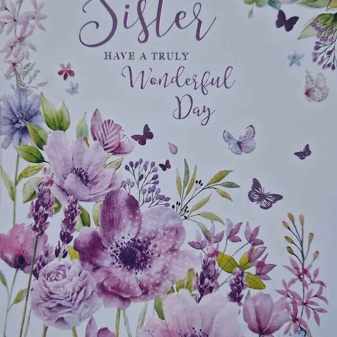 Sister, Flowers, butterflies, purple, lilac, purple foil lettering and design.