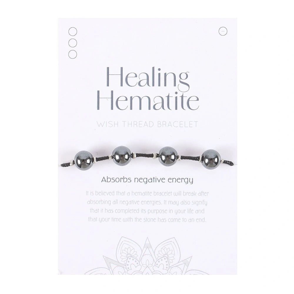 Release negative energy with this healing hematite bracelet. Adorned with hematite gemstones on a black thread bracelet, it is believed to break once it has absorbed enough negative energy, making it a powerful accessory for those seeking protection and positivity. Presented on a matching backing card. Designed by Something Different Wholesale and part of the Healing Hematite range of hematite crystal accessories.