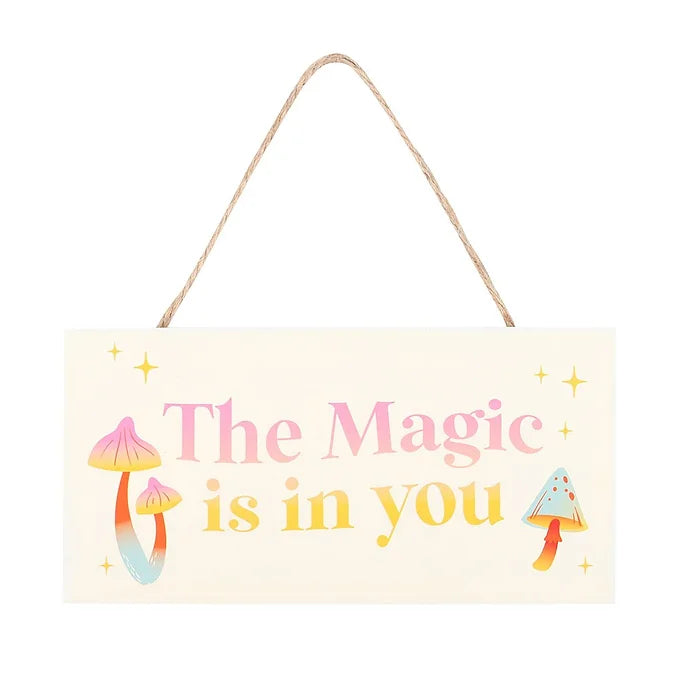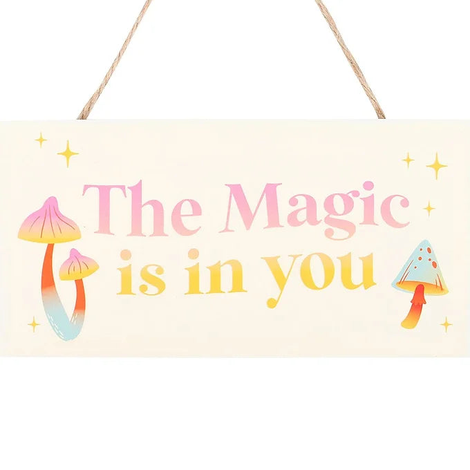 Use this sign as a groovy reminder to trust your gut. Features a vibrant mushroom design and "The magic is in you" text for a boost of motivation and positivity.