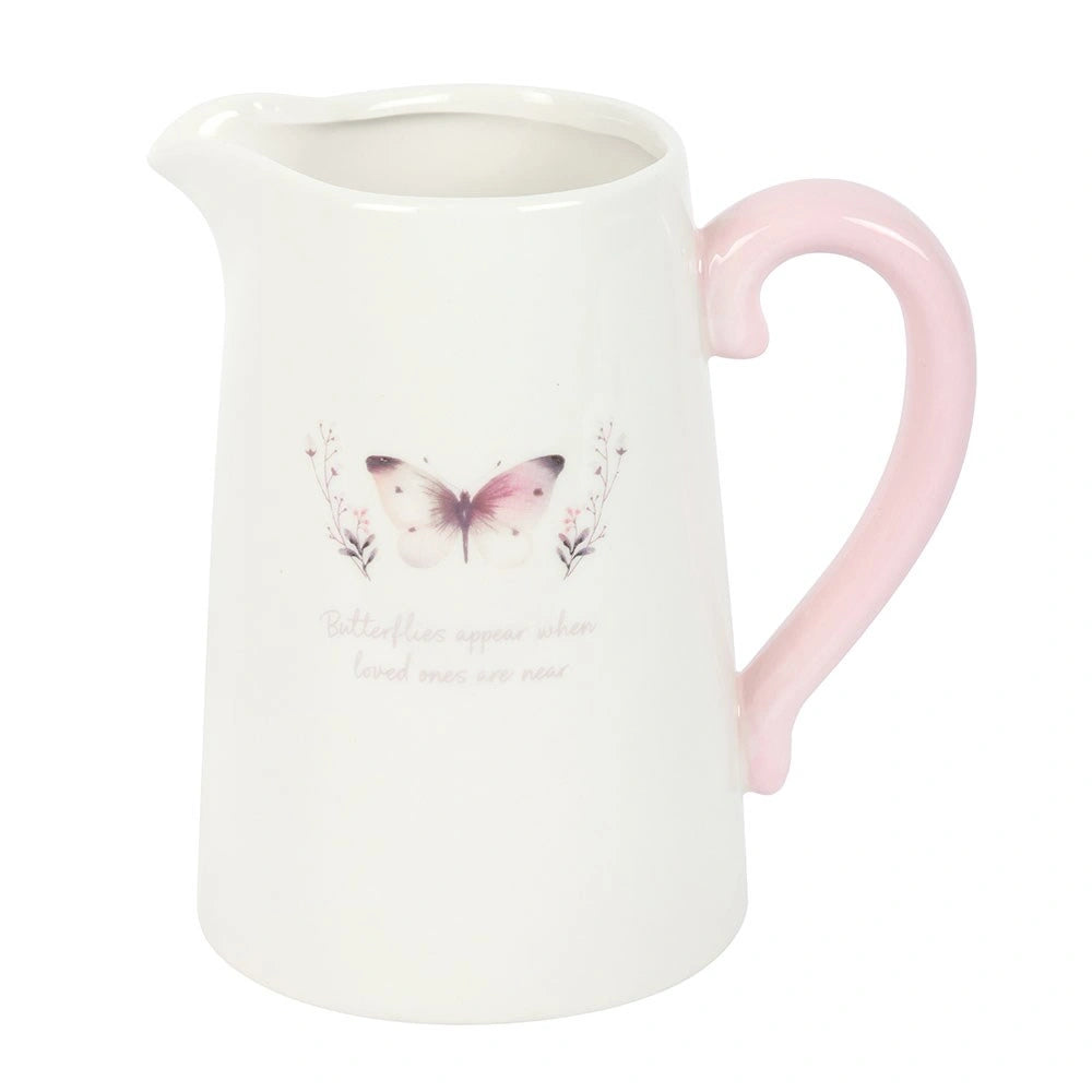 Add a thoughtful touch to the home with this decorative ceramic jug, perfect for displaying fresh blooms or dried flowers. Featuring a delicate grey butterfly design and the heartfelt words 'Butterflies appear when loved ones are near', this piece makes a meaningful gift for anyone cherishing the memory of someone special. Part of the White Butterfly collection of sentimental gifts and home decor.