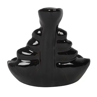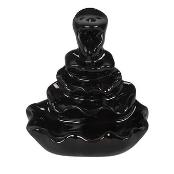A black ceramic backflow incense burner with a rippled tier design. When a backflow cone is placed on top, smoke gently flows from tier to tier. Beautiful to watch.