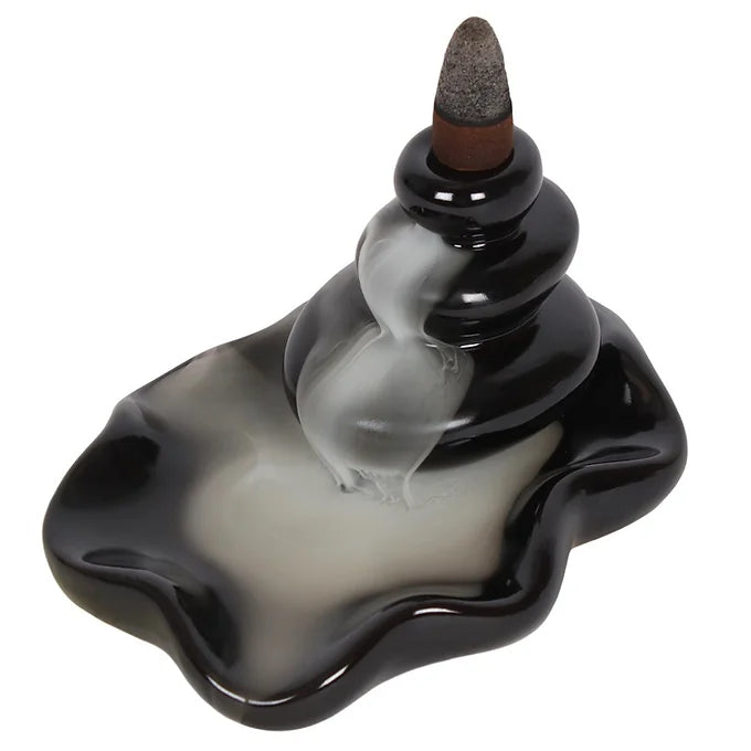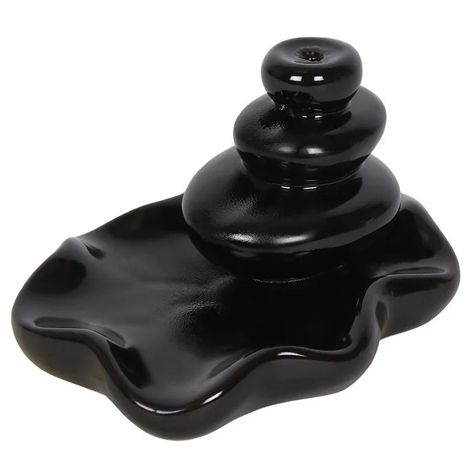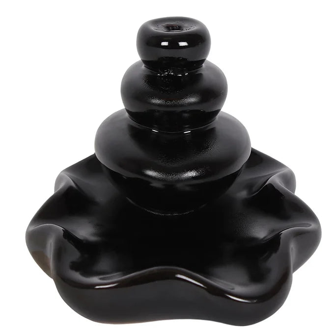 A stunningly simple backflow incense burner in a large black ceramic stacked pebble design. When the cone is lit the smoke from the cone cascades downwards in a mesmerising waterfall effect to pool at the bottom. Beautiful to watch.