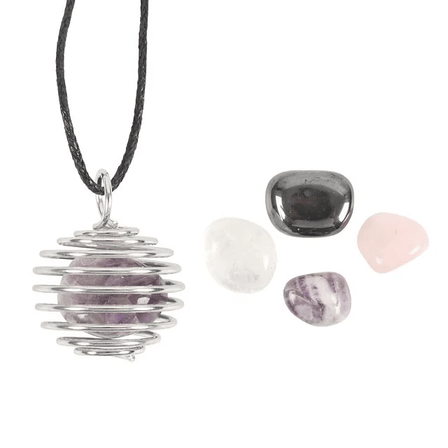 Our Build Your Own Crystal Necklace Kit is the perfect gift for anyone who loves to create their own jewellery. Includes 4 tumblestones and a nickel-free spiral cage necklace for easily swapping out the stones. Crystals include amethyst, rose quartz, clear quartz, and hematite presented in a matching gift box. This kit is a great way to spend a relaxing afternoon or to make a thoughtful gift for a friend or loved one.