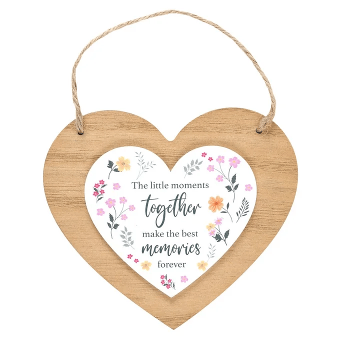 Whether for Mother's Day, birthdays or 'just because', this heart-shaped hanging sign makes a sweet gift for any special lady. This design features 'The little moments together make the best memories forever' text surrounded by cheerful florals in pink, yellow and green and is strung on a jute cord.