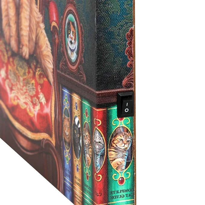 Measuring 30x30cm, this square canvas features a high quality colour print of the 'Mad About Cats' artwork by popular artist Lisa Parker. Light up details bring this magical piece to life. The switch is located on the side of the canvas and may be slightly obscured by the packaging upon delivery. Requires 2 x AA batteries.
