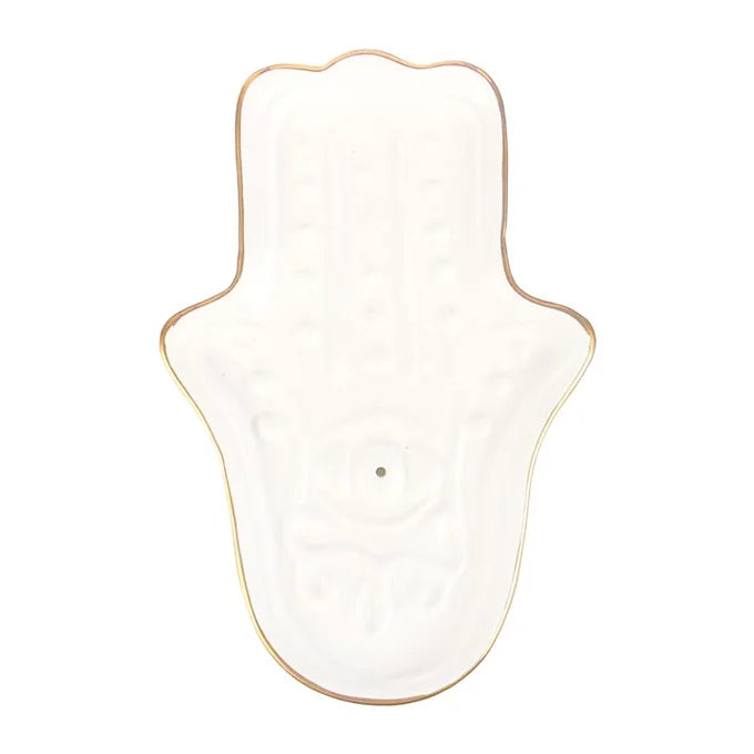 Awaken your senses with this ceramic incense holder shaped like a traditional hamsa hand, also known as the hand of Fatima. Finished in calming white, this ceramic holder will look elegant on a side table or nightstand while catching falling ash.