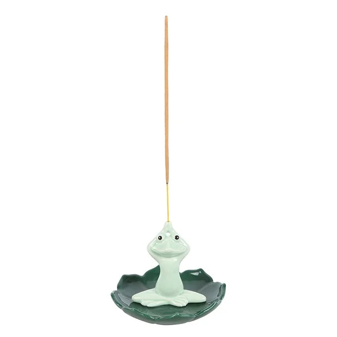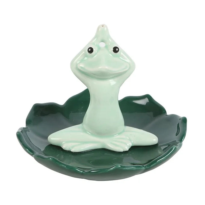 Calm nerves and realign your chakras with this ceramic incense holder shaped like a yogi frog. Seated in a sukhasana pose in a green lotus flower, this ceramic holder will look charming on a side table or nightstand while catching falling ash.