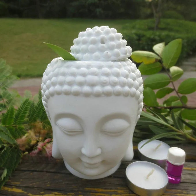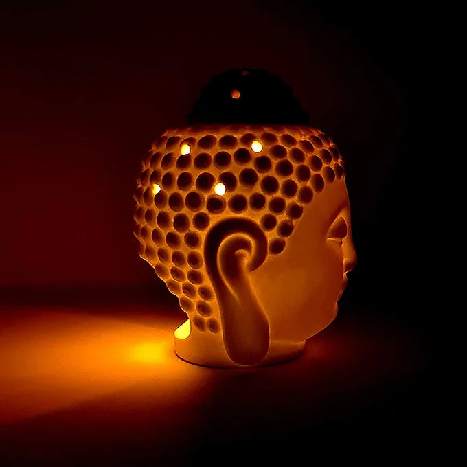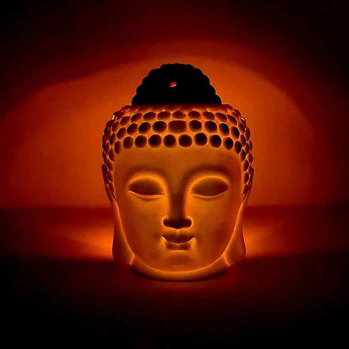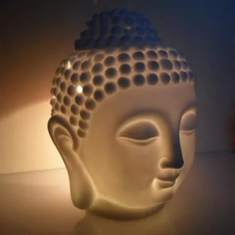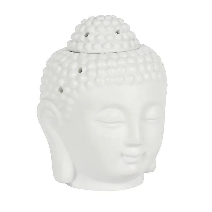 A matte white Buddha head oil burner. This item can also be used as a wax melt burner however it is advisable to consider the size and depth of the bowl when adding wax to ensure it will not overrun the edges when melted.