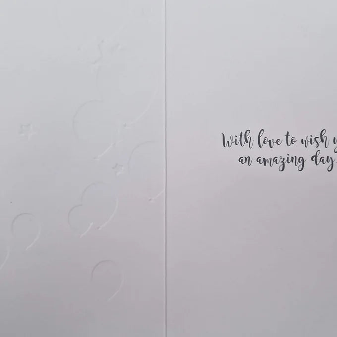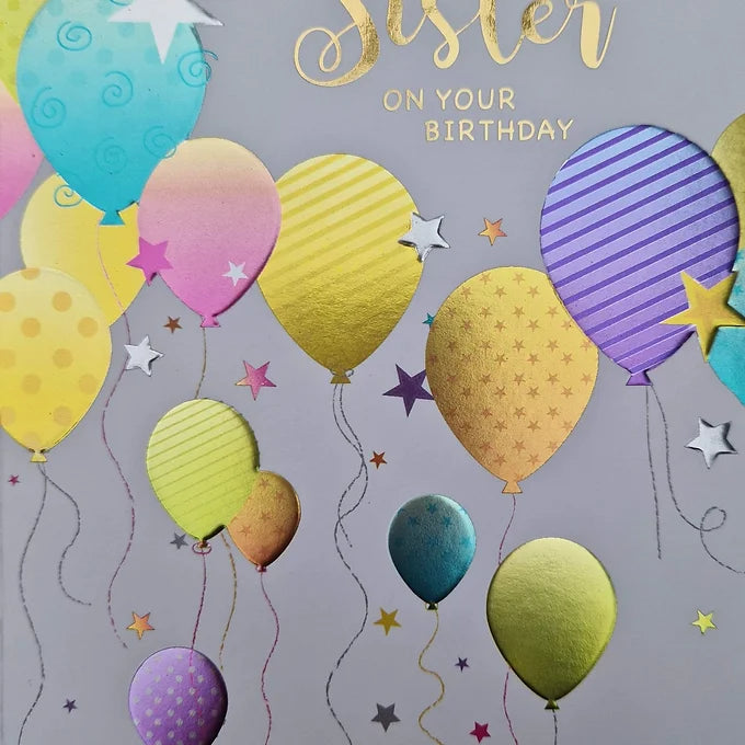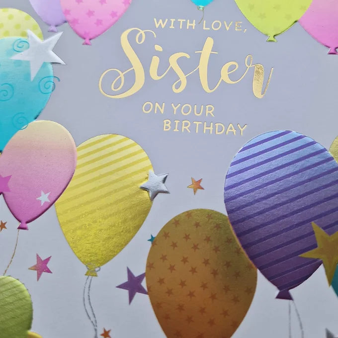 Sister, Flowers, butterflies, pink, green, lilac, gold foil lettering and design.