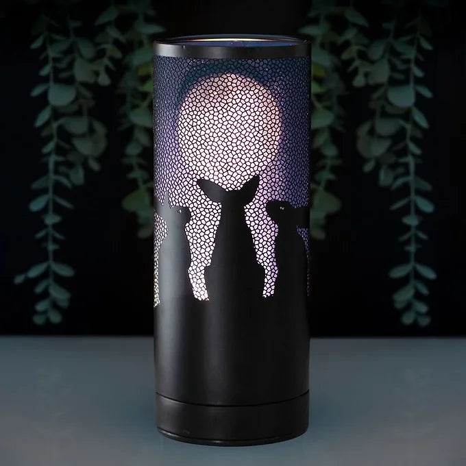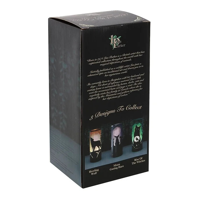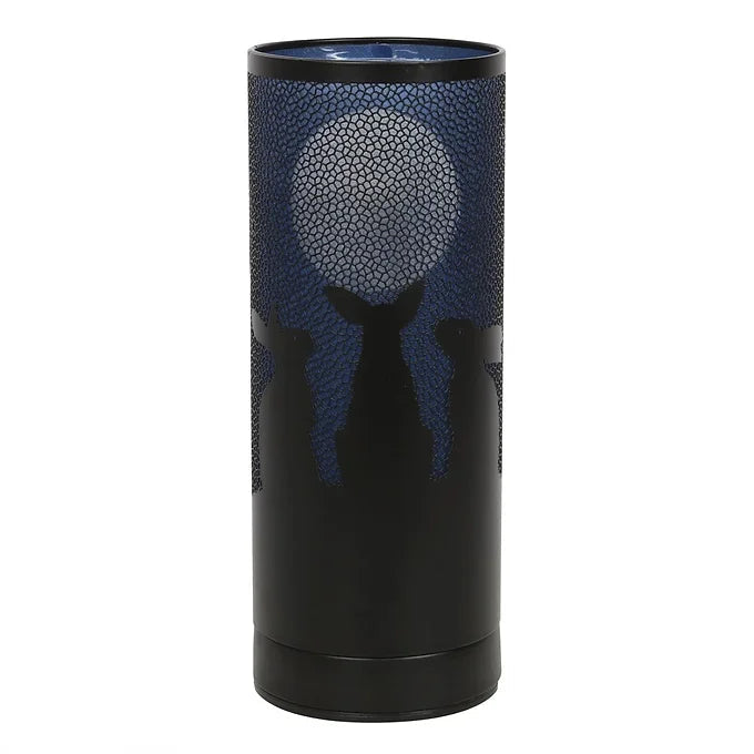 Lisa Parker's stunning 'Moon Gazing Hares' artwork creates the perfect focal point for this aroma lamp. A black silhouette of three hares and a full moon overlays an purple background that is illuminated from behind. Use with fragrance oil to gently fragrance the home.