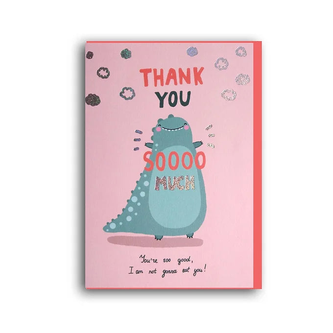 Funny Dinosaur Thank You Card with silver lettering and elements.