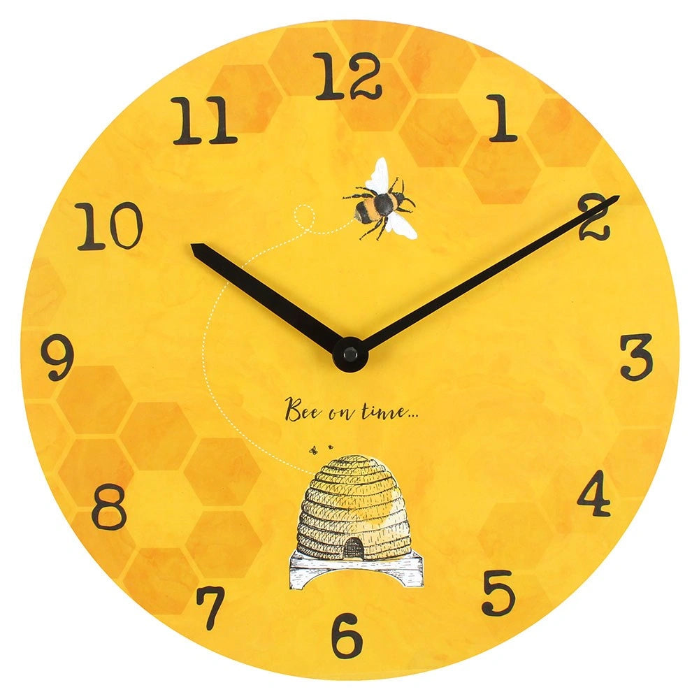 Brighten up any space with this cheerful bee-themed wall clock, perfect for adding personality to kitchens, living rooms or hallways. Featuring the playful phrase 'Bee on Time', it's a fun and functional piece that helps turn a house into a home. Requires 1x AA battery to operate (not included).
