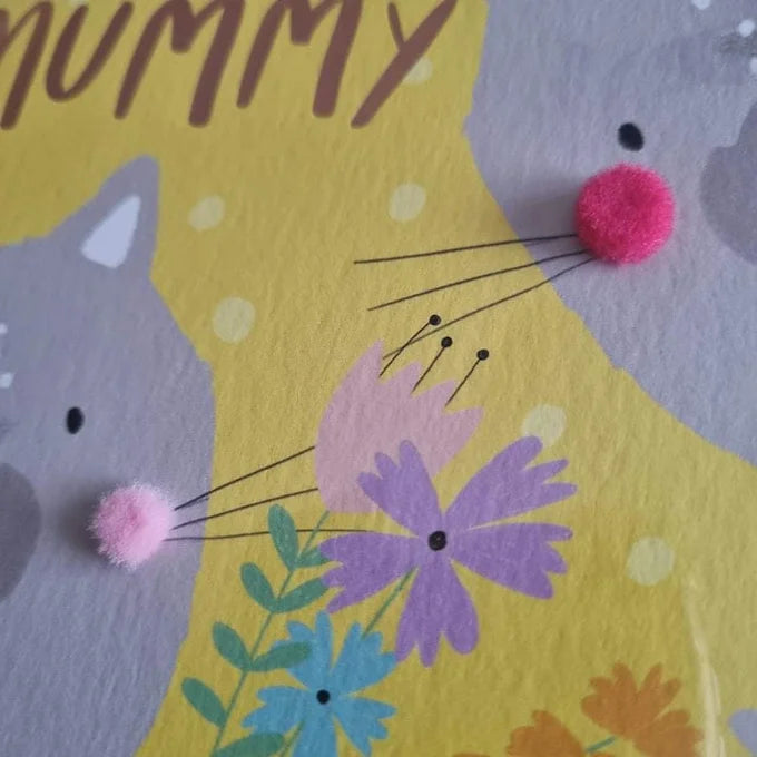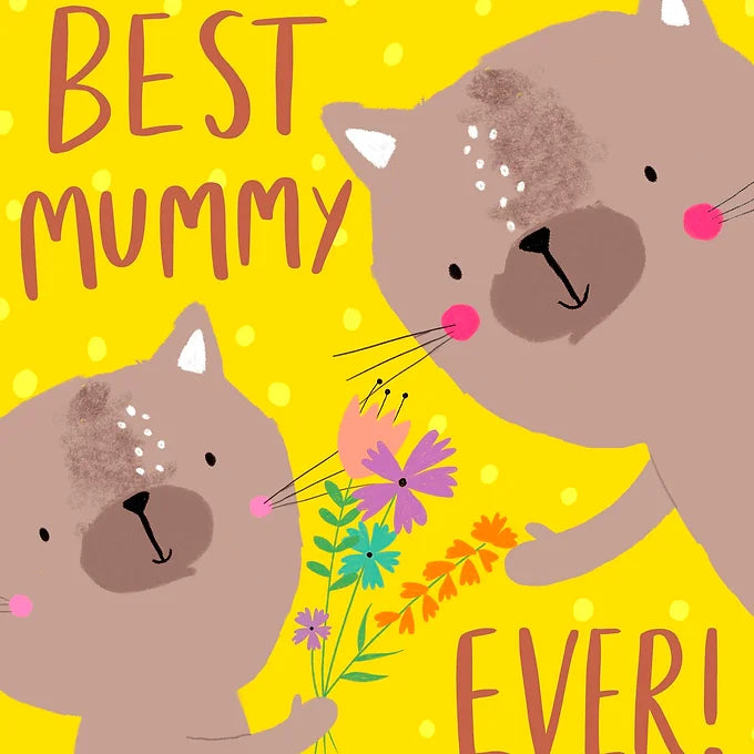 Happy Birthday Mummy Card, nice and colourful with baby cat giving Mummy cat flowers to BEST MUMMY EVER!