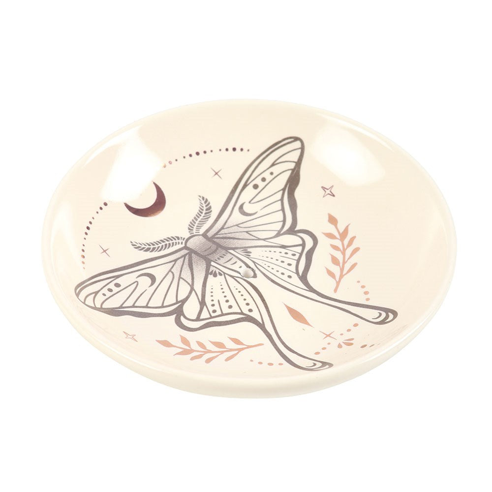 Perfect for adding an ethereal touch to any space, this incense dish is adorned with an elegant luna moth design. The holder is thoughtfully designed to accommodate both incense sticks and cones, featuring a small hole in the centre for sticks and a flat stable surface for burning cones. Part of the Dark Forest collection of gifts and decor.